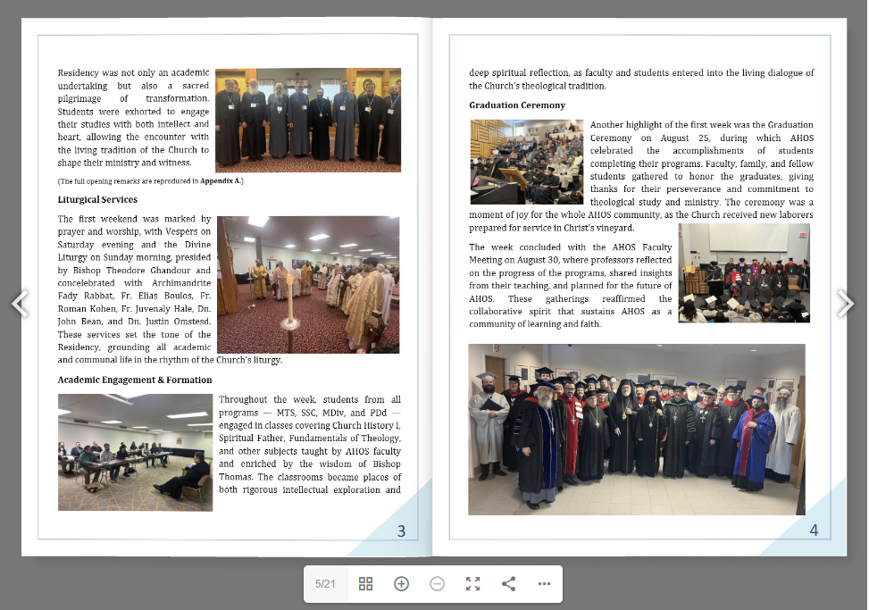 The report provides a comprehensive overview of the Residency’s sessions, liturgical life, graduation ceremony, and faculty meetings. It also includes appendices with speeches, reflections, and highlights that capture the spirit of the event.
